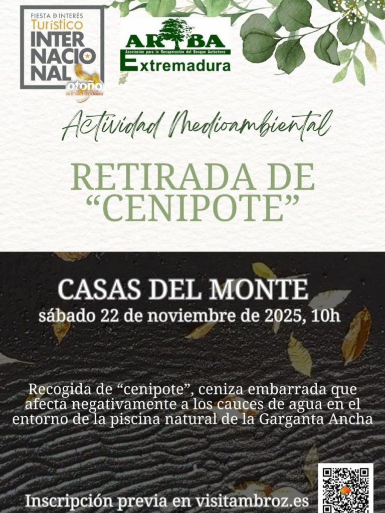 La Asociación para la Recuperación del Bosque Autóctono (ARBA) Extremadura ha convocado una actividad medioambiental para el próximo sábado 22 de noviembre en la localidad de Casas del Monte. La jornada, que comenzará a las 10 de la mañana, está dedicada a la retirada de cenipote, una ceniza embarrada que está afectando negativamente a los cauces de agua en el entorno de la piscina natural de la Garganta Ancha.