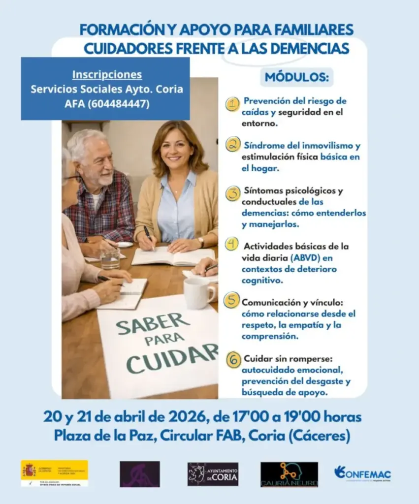 Los días 20 y 21 de abril, en horario de 17:00 a 19:00 horas, se celebra en Coria la actividad formativa Formación y apoyo para familiares cuidadores frente a las demencias, dirigida a personas que cuidan en el entorno familiar a pacientes con demencia. El curso se desarrolla en la Plaza de la Paz, Circular FAB de Coria, y de forma paralela en la casa de cultura de la pedanía de Puebla de Argeme en los mismos días y horario.