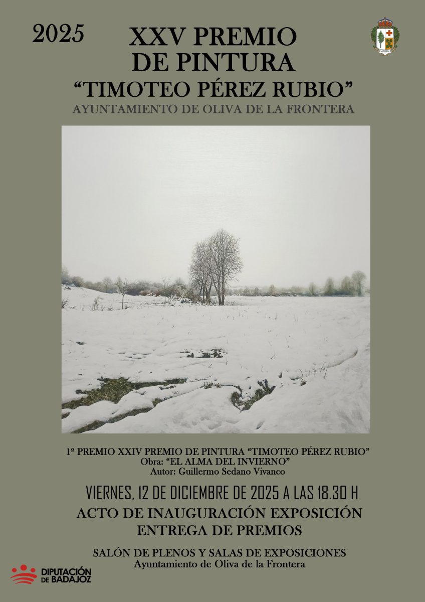 El Premio de Pintura Timoteo Pérez Rubio alcanza su vigésimo quinta edición con la participación de 317 obras procedentes de países como Argentina, Brasil, Canadá, México, Perú, Uruguay, Venezuela, Italia y Francia, entre otros. La inauguración de la exposición y la entrega de premios se celebrará el 12 de diciembre en Oliva de la Frontera.