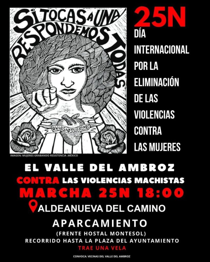 Las vecinas del Valle del Ambroz han convocado una marcha contra las violencias machistas que tendrá lugar el 25 de noviembre a las 18:00 horas en Aldeanueva del Camino con motivo del Día Internacional por la Eliminación de las Violencias contra las Mujeres. La manifestación se enmarca en la reivindicación de arrancar la violencia de raíz y cosechar más latidos bajo el lema «Ni una más».