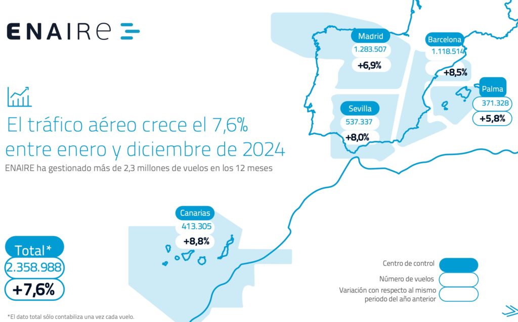 ENAIRE gestiona más de 2,3 millones de vuelos en 2024 y marca un nuevo récord histórico
