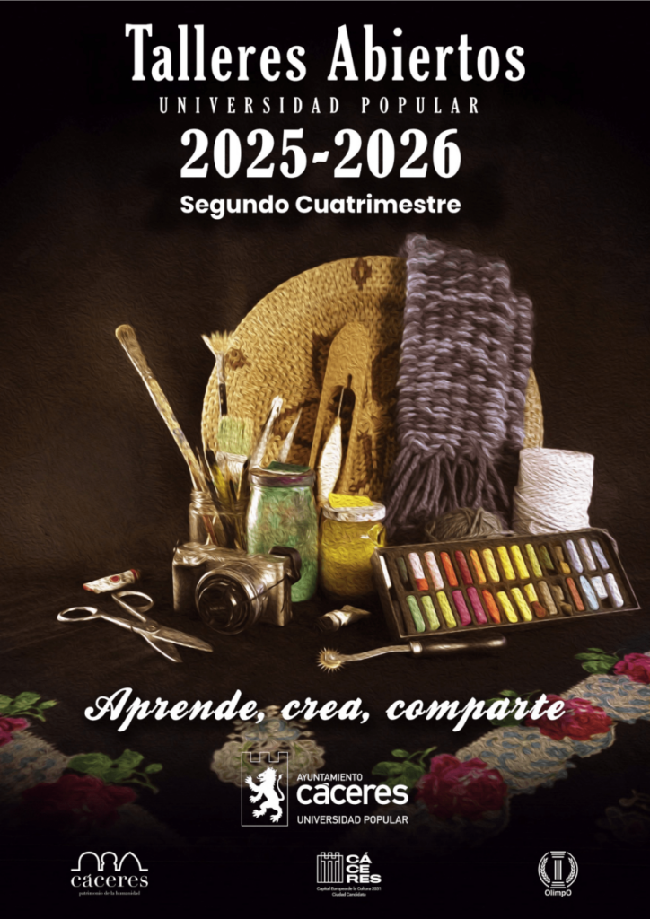 La Universidad Popular del Ayuntamiento de Cáceres ha presentado la segunda convocatoria de cursos y talleres abiertos con 139 plazas distribuidas en 15 talleres de carácter cuatrimestral. Las inscripciones estarán abiertas entre el 9 y el 25 de febrero, según el curso seleccionado, y la adjudicación de plazas se realizará mediante sorteo público.