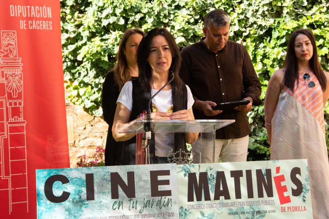 La Diputación de Cáceres ha presentado una nueva edición de los programas «Cine en tu Jardín» y «Matinés de Pedrilla», que se desarrollarán los martes y domingos del mes de junio, respectivamente, en los Jardines del Museo Pedrilla-Casa Guayasamín. La vicepresidenta primera de Territorio, Igualdad y Cultura, Esther Gutiérrez, ha presentado la programación junto a la directora y guionista María Sánchez Testón, el director de la Banda Sinfónica Provincial, Antonio Luis Suárez y la directora del Conservatorio Oficial de Música Hermanos Berzosa de Cáceres, Rosana Garay.