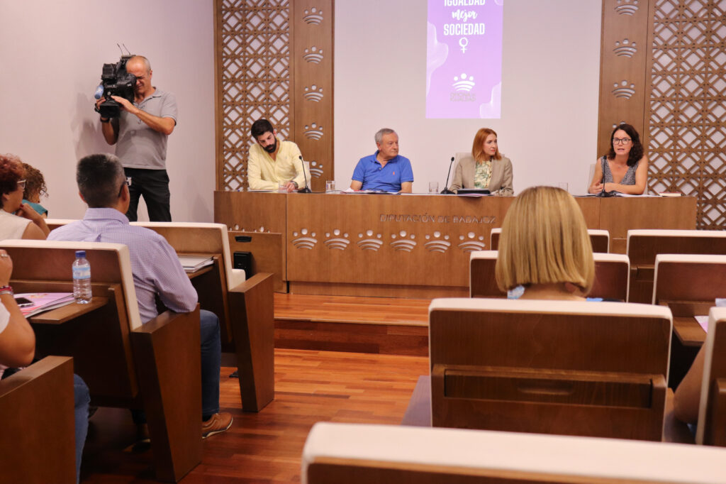 La diputada de Igualdad, Lourdes Linares, acompañada por el presidente provincial de Cruz Roja, Alfonso Méndez, y María Gómez y Jesús Amaro, técnicos del programa, presentó hoy ‘Autoexpresión, Empoderamiento, Ocio y Tiempo Libre de Hijas e Hijos de Mujeres Víctimas de Violencia de Género’ conocido como Proyecto Mariposas.