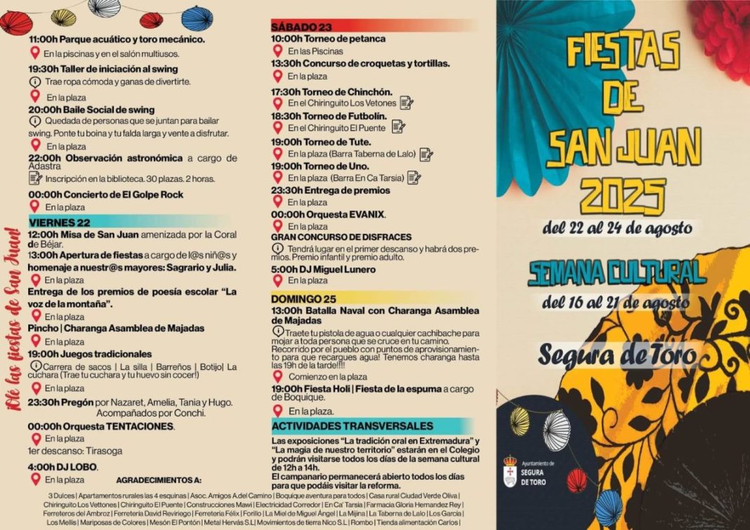 Segura de Toro celebrará su Semana Cultural del dieciséis al veintiuno de agosto y las Fiestas de San Juan del veintidós al veinticuatro de agosto con una extensa programación que incluye actividades deportivas, culturales y musicales para todos los públicos. El Ayuntamiento de Segura de Toro organizó una completa agenda festiva que comenzará con los eventos culturales y culminará con las tradicionales fiestas patronales.