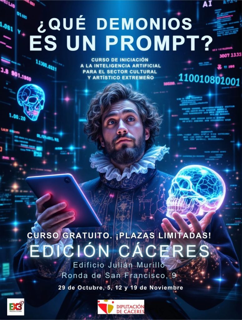 La Diputación de Cáceres y EX3 Producciones organizan un curso de iniciación a la Inteligencia Artificial aplicada a la gestión y creación cultural, con 20 plazas gratuitas. La formación presencial se desarrollará los días 29 de octubre, 5, 12 y 19 de noviembre, de 11.00 a 14.00 horas, en el Edificio Julián Murillo de Cáceres. Las inscripciones están abiertas a través de https://ex3.es/curso-ia/.